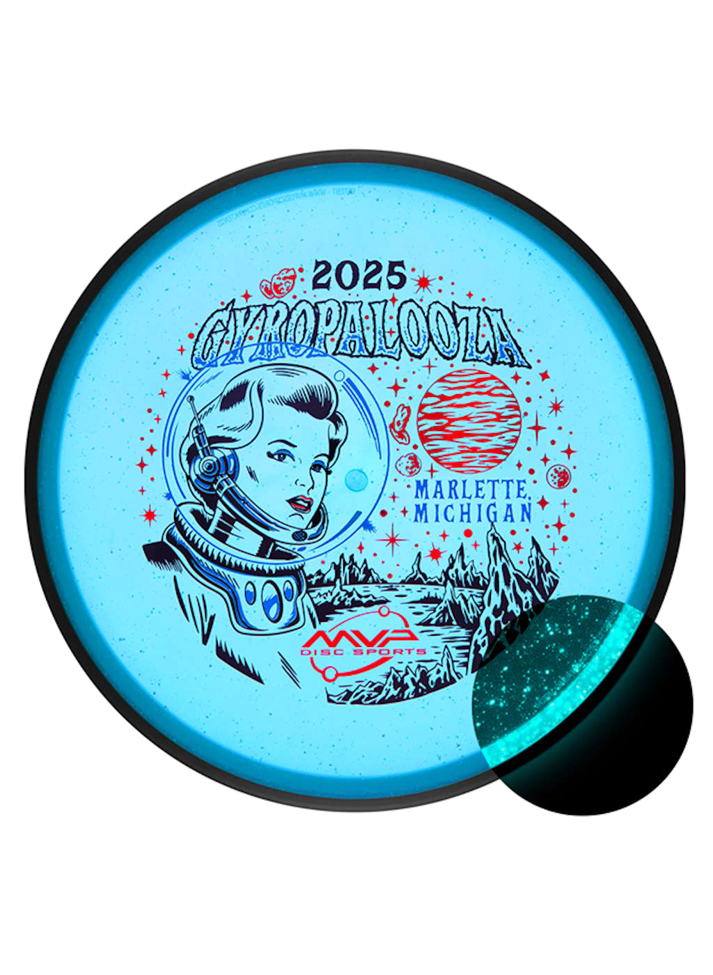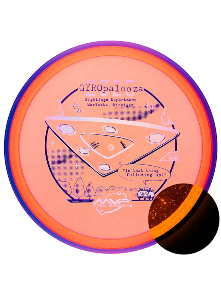 - The Particle Glow Proton Pyro! For the second time ever, the Pyro is releasing with a non-Prism rim, and this time it's with a gorgeous Particle Glow core! Featuring an illustration by ZAM based on real UFO sighting from the Sightings Department, the Pyro has rarely looked so good. Known for its controllably overstable but glide-filled flight, the Pyro has proven itself a staple midrange in many bags. Add this gorgeous Particle gem to your collection, exclusively in the 2025 GYROpalooza Box!