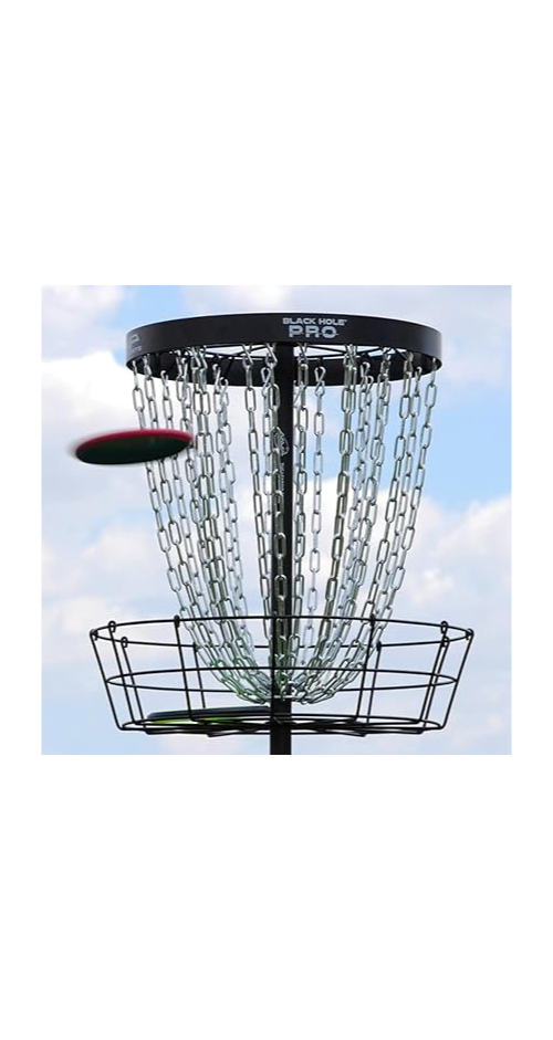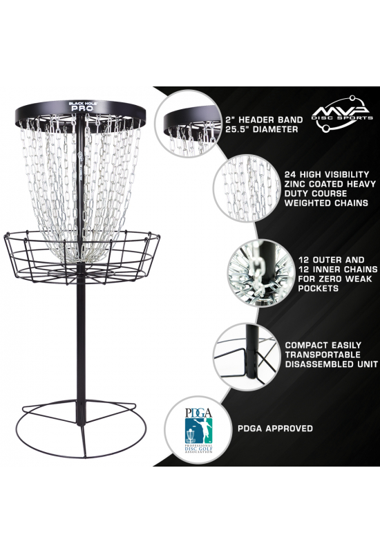 Create an accountThe Black Hole® Pro is designed to bring the most realistic putting experience to the portable basket market. Available in sleek, seamless matte black, the Black Hole® Pro focuses on creating zero weak pockets, reducing cut throughs, and minimizing pole bounces. With its 24 total inner and outer chains, the Black Hole® Pro brings you the highest quality disc golf experience.