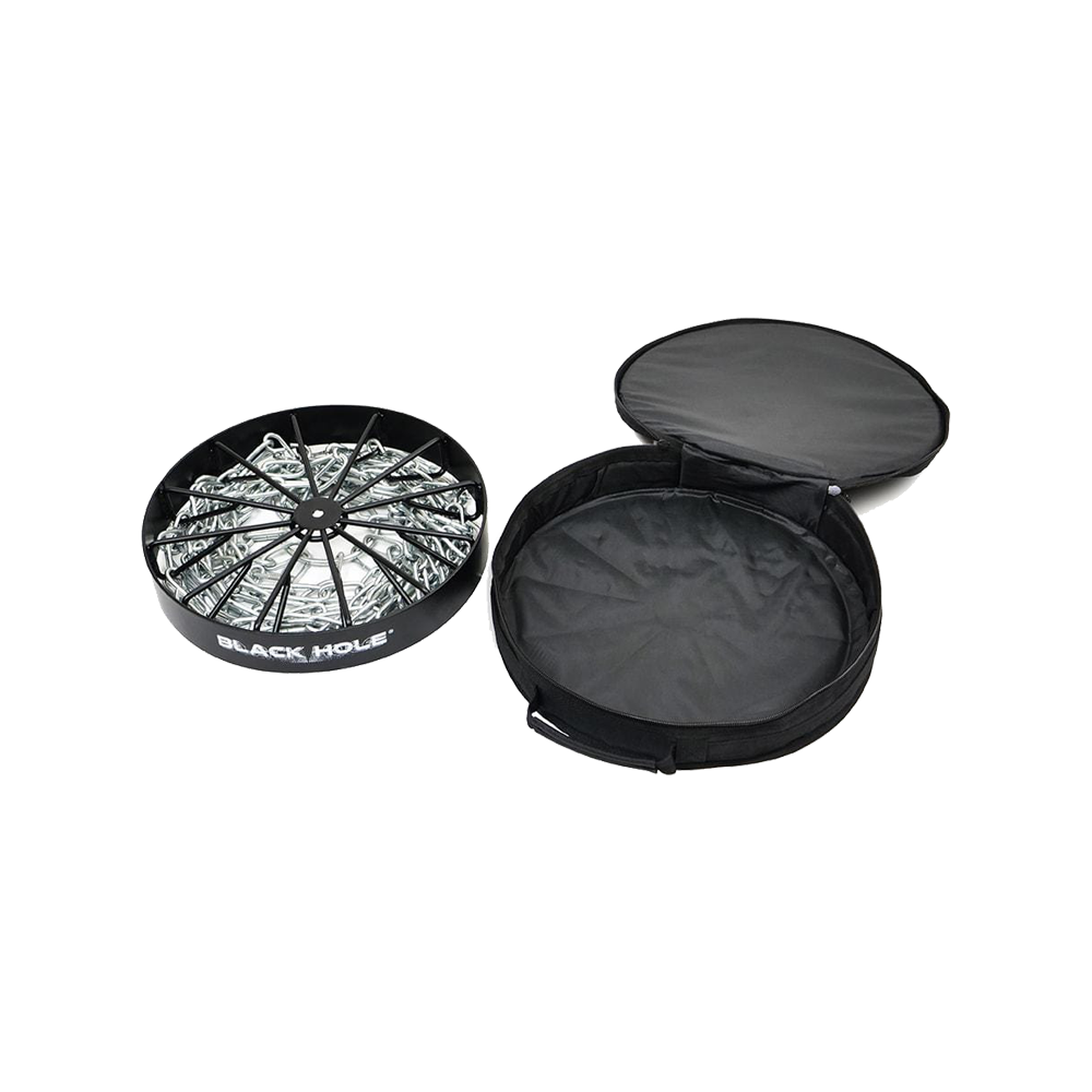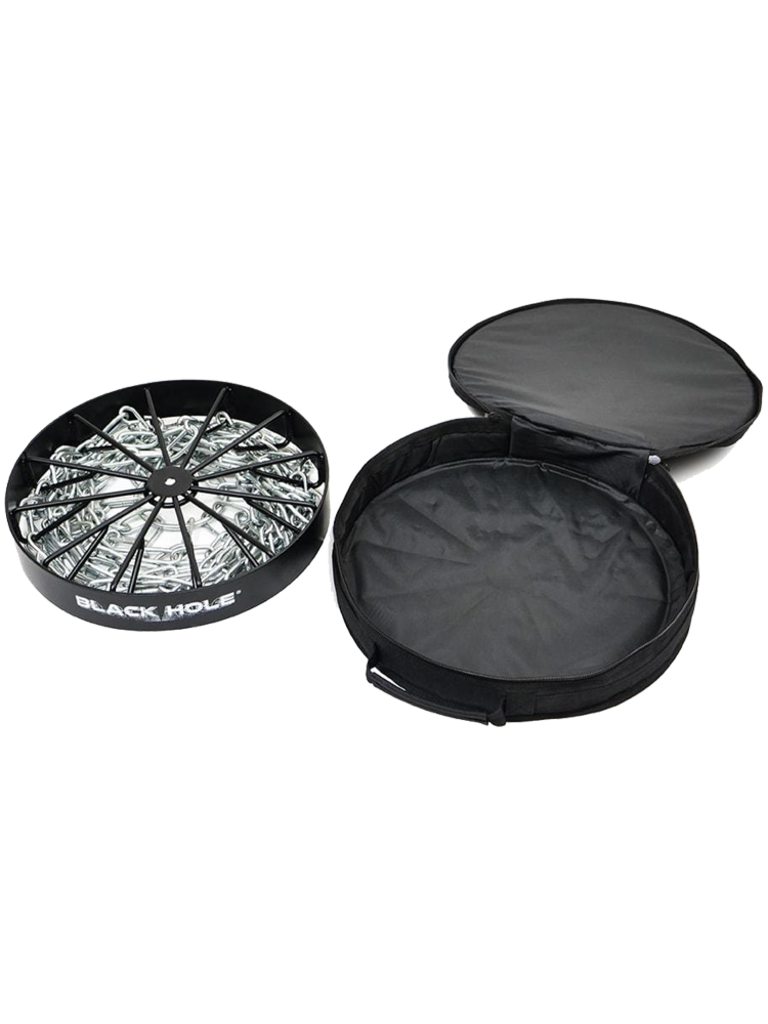 Also included with the Black Hole® Transit case is a smaller bag for the header band and pro chain rack. Both bags have reinforced padded handles to provide a comfortable grip. For home practice, field work, or temporary courses, the Black Hole® Pro with Transit bag is the disc golfer’s best choice. Protect your Black Hole® Pro with the heavy duty Black Hole® Transit Bag.