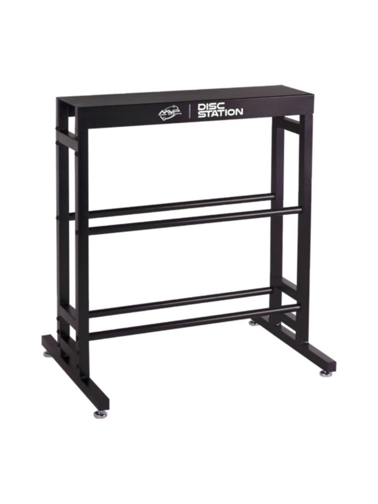 The Disc Station II is a smaller version of MVP’s storage rack used for organizing a disc collection. The Disc Station II features two shelves and a metal build that is designed to look and feel like the most premium disc shelving unit in the industry. Each shelf holds upwards of 40 discs for 80 discs in total and the beautiful black metal unit looks fantastic either indoors or in the garage.