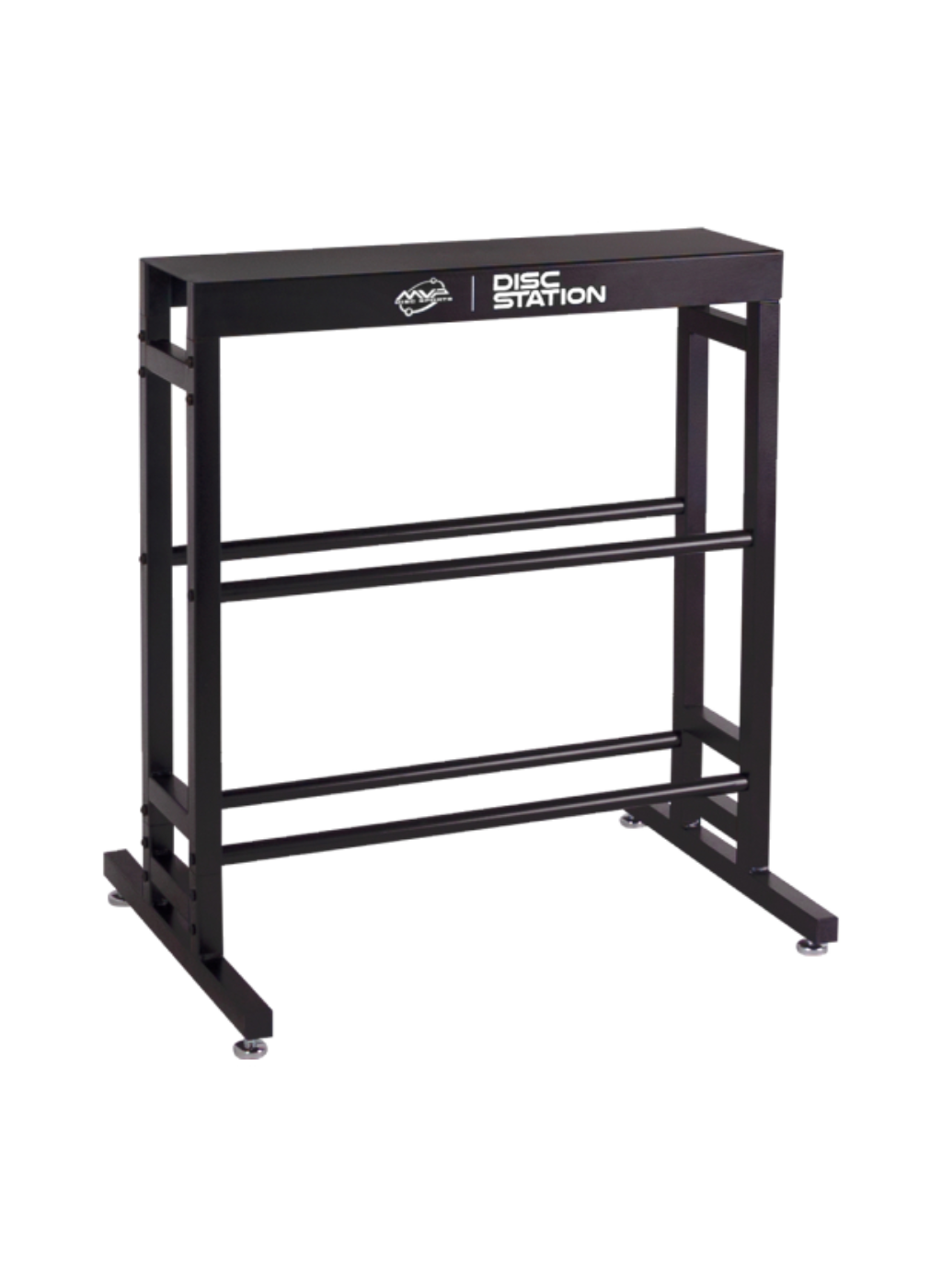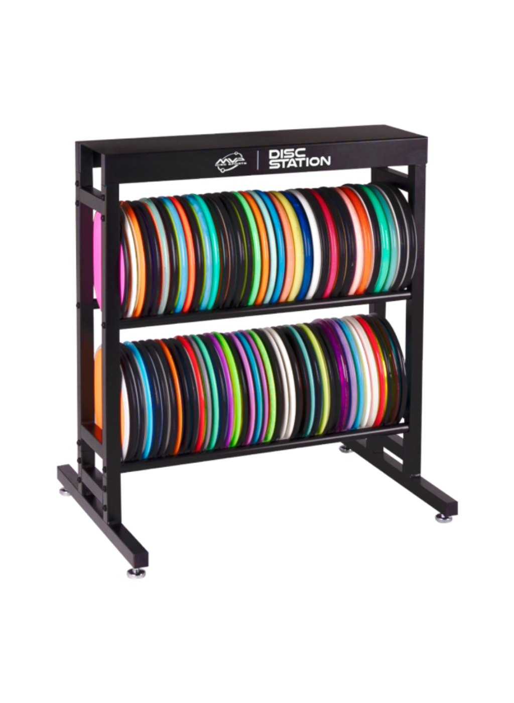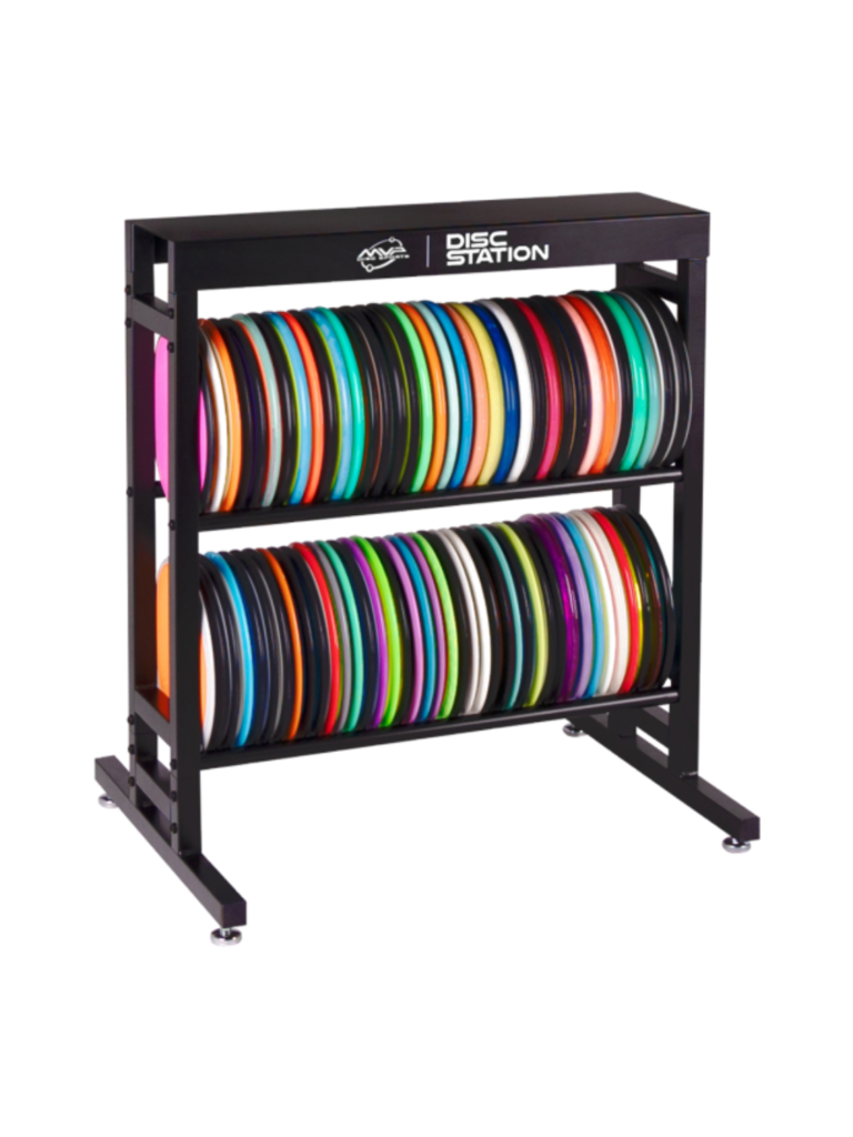 The Disc Station III is a compact, premium disc storage rack with a sleek black metal build. It features two shelves, each holding up to 40 discs for a total capacity of 80 discs. Perfect for keeping your collection organized at home or in the garage.