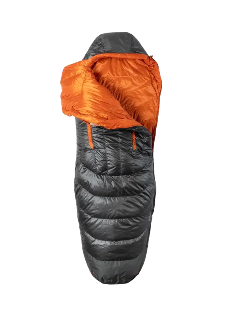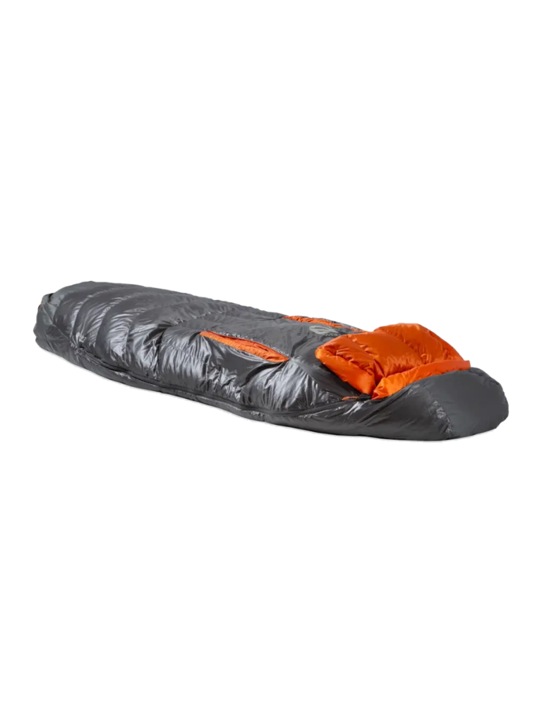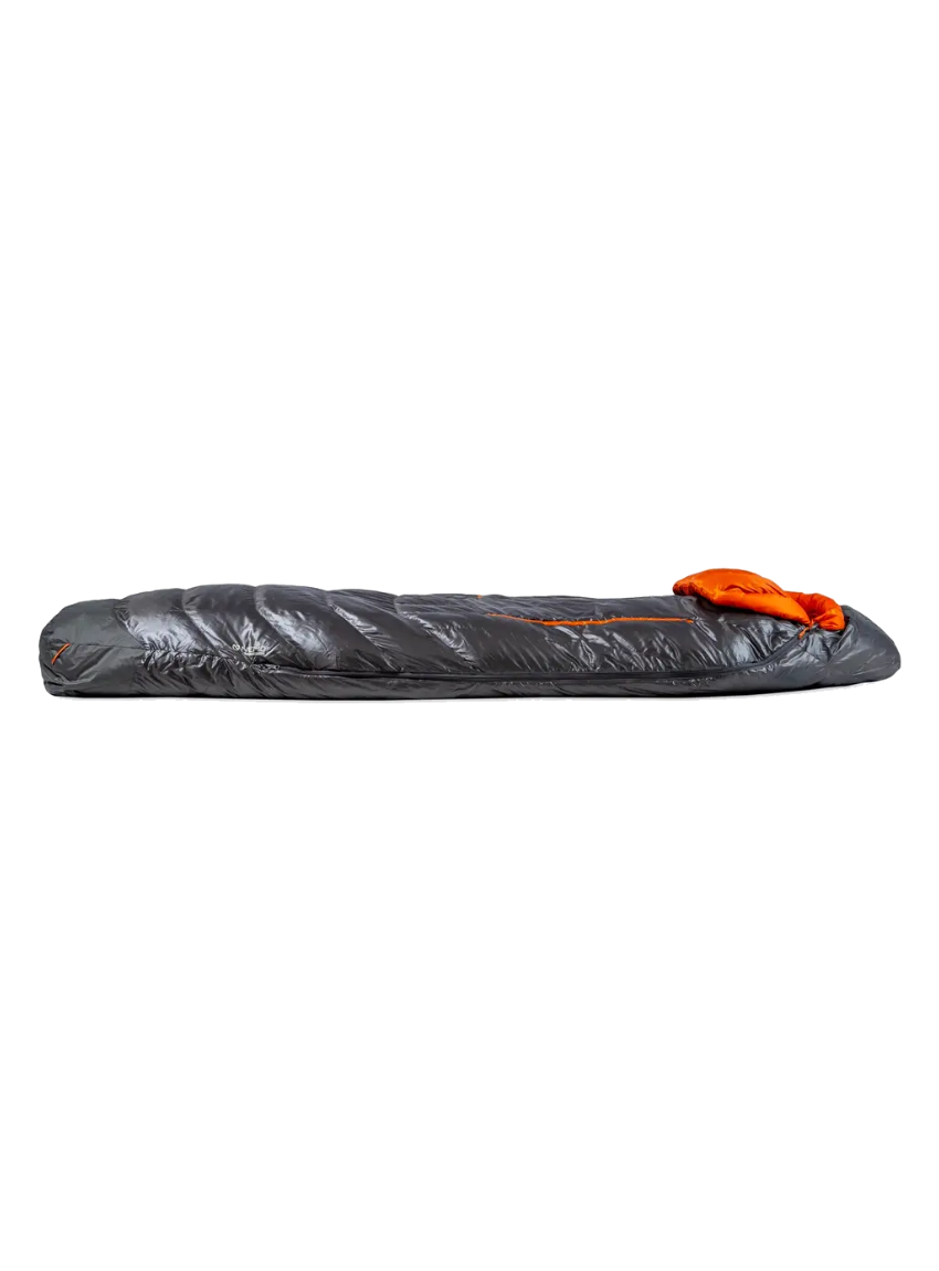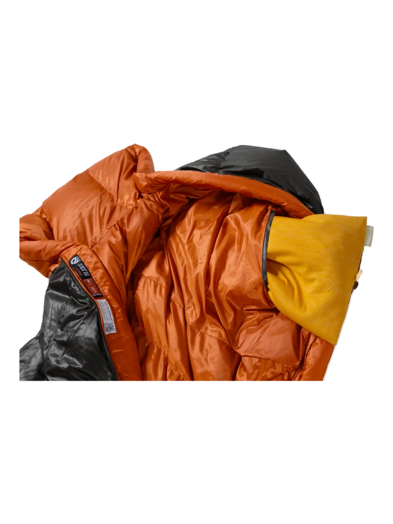 - Hood and footbox are reinforced with recyclable material treated with PFAS-free waterproofing to prevent tent condensation from soaking into the bag’s fabric.