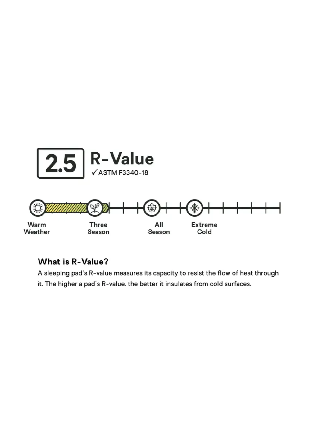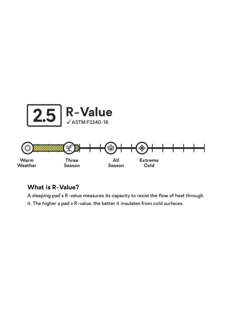 The internal architecture provides unparalleled stability and weight distribution, using low-stretch die-cut trusses to eliminate springiness while protecting elbows and hips from poking through to the ground. A new internal layer of ultra-thin film reduces convection currents and adds R-value. Insulated versions utilize multiple layers of suspended Thermal Mirror™ metallized film, resulting in a lighter, remarkably quiet sleeping pad compared to the competition.