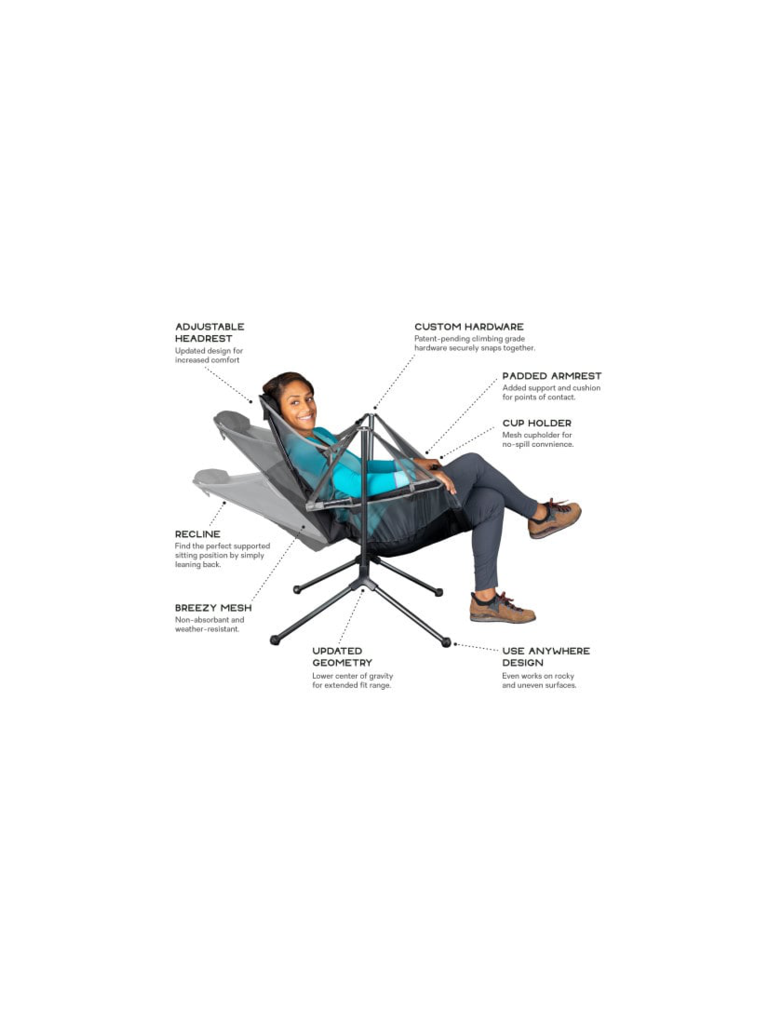 Create an accountThe next generation in camp comfort, Stargaze has been re-engineered for even more comfort and stability, with a lower center of gravity and extended fit range. This first-ever swinging and reclining camp chair takes relaxation to a new level. The swinging offers an exciting new sitting experience, with a relaxing motion that is designed for comfort. And when you’re ready to recline, simply lean back to activate the auto-reclining mechanism and enjoy a great view of the stars.