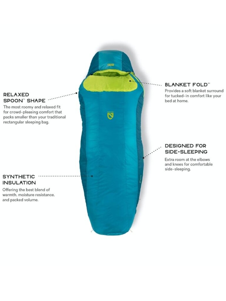Seventy percent of people sleep on their side, yet mummy bags are not designed to accommodate this. The new Tempo™ blends roomy comfort with NEMO’s popular Spoon™ shape for a relaxed, crowd-pleasing fit that packs smaller than a rectangular sleeping bag. With a generous cut at the elbows and knees, side sleepers can shift positions comfortably throughout the night.