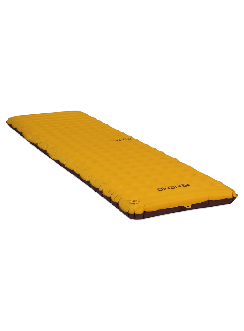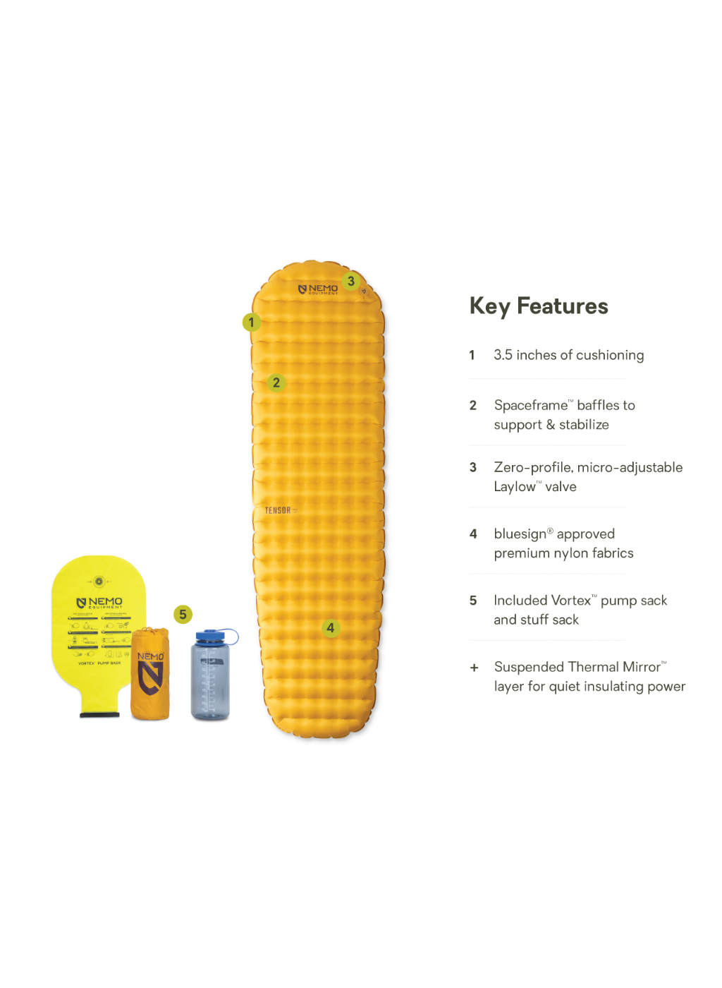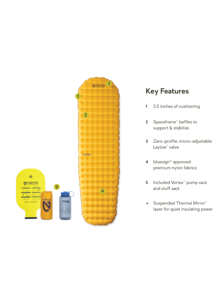 Create an accountThe pad’s interior features NEMO’s proprietary Spaceframe™ baffle design, which utilizes low-stretch fabric trusses to create stable support and offer just the right amount of give — all while avoiding any wobbly waterbed feeling. Inside each baffle is a suspended layer of ultra-thin, metallized Thermal Mirror™ film, which efficiently reflects body heat and contributes to the pad’s overall 2.8 R-value. The layer’s clever floating construction eliminates the crinkling, crunchy sound that many insulated air pads are known for, earning Tensor a reputation for peace and quiet under the stars.