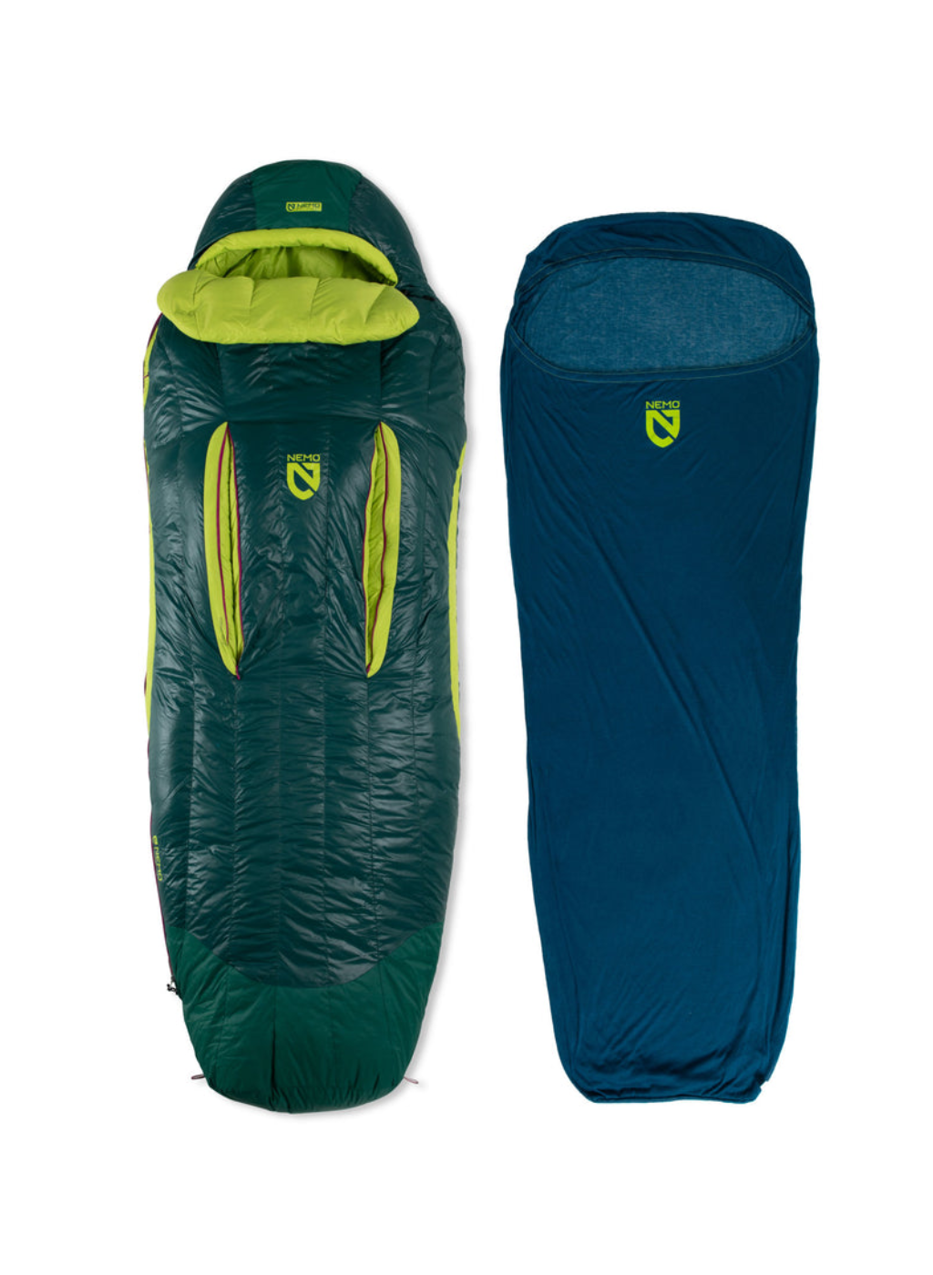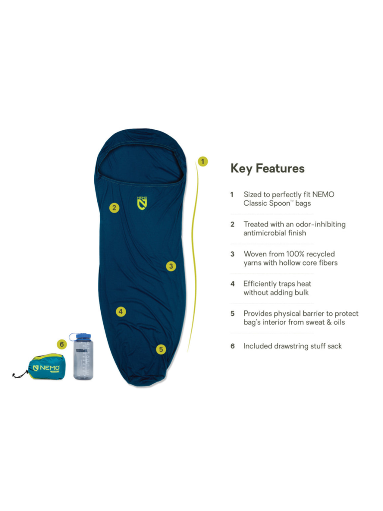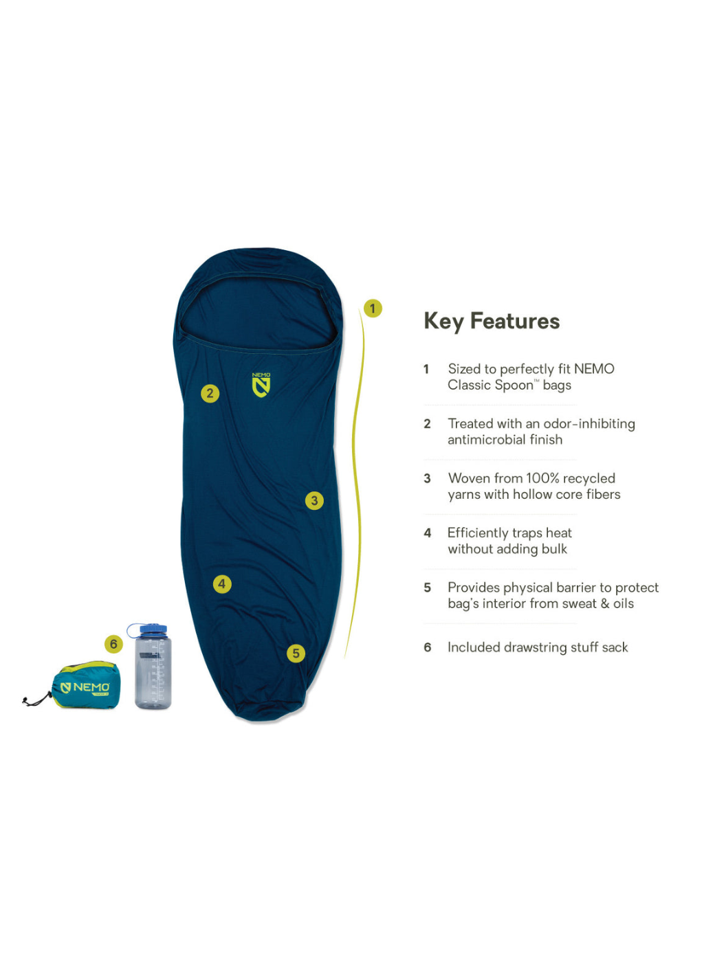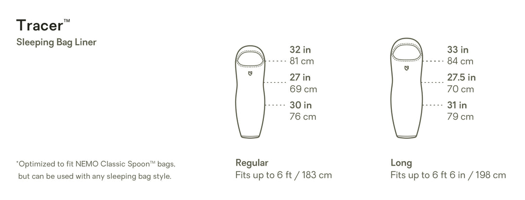 Tracer is made with lightweight THERMOLITE® EcoMade fabric, a material woven from 100% recycled yarns with hollow core fibers. These hollow fibers efficiently trap heat to moderately extend the temperature range of your sleeping bag without adding bulk or excess weight to your pack. Though Tracer is optimized for NEMO Classic Spoon bags (Disco™, Forte™), it can be used as a layer inside any sleeping bag, from rectangle to mummy style.