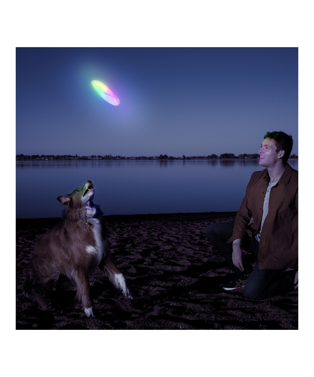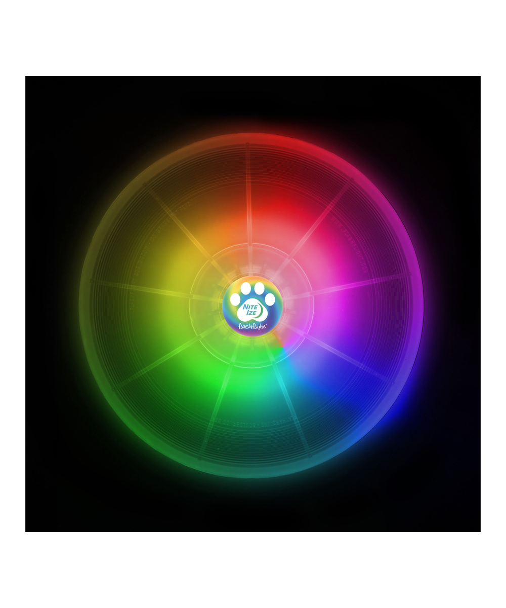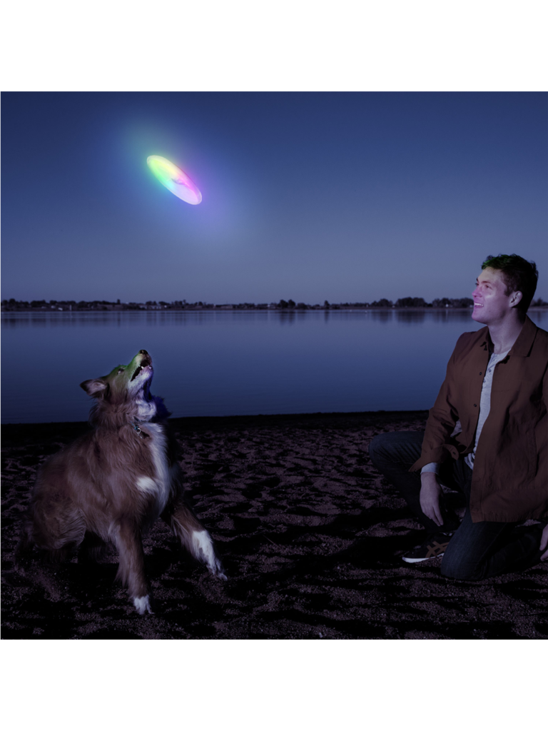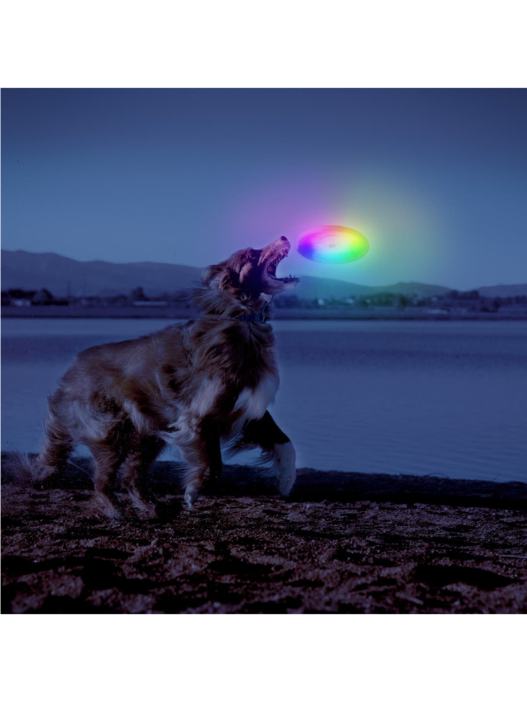 Create an accountDesigned for superior flight, our Flashflight LED Dog Discuit is a soft-touch plastic flying disc made specifically for nighttime play with your disc-loving dog. It's illuminated by a super-efficient, long-lasting LED, so it glows brightly in the dark. The Dog Discuit is not only super fun, it's mouth friendly, bite durable, and has a canine-resistant cap that helps prevent dogs from chewing off the battery and LED housing. Available in our fun, color changing Disc-O LED color, the Dog Discuit comes with two replaceable, long-life batteries, for endless seasons of fun under the stars.