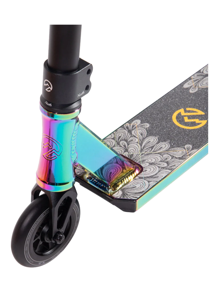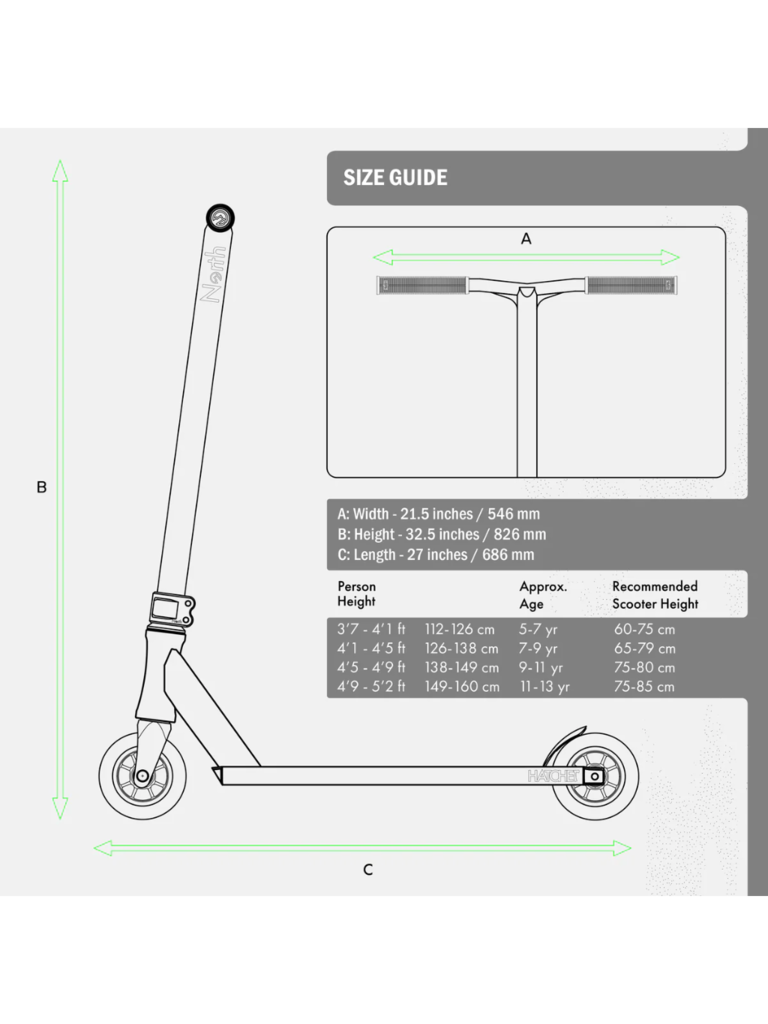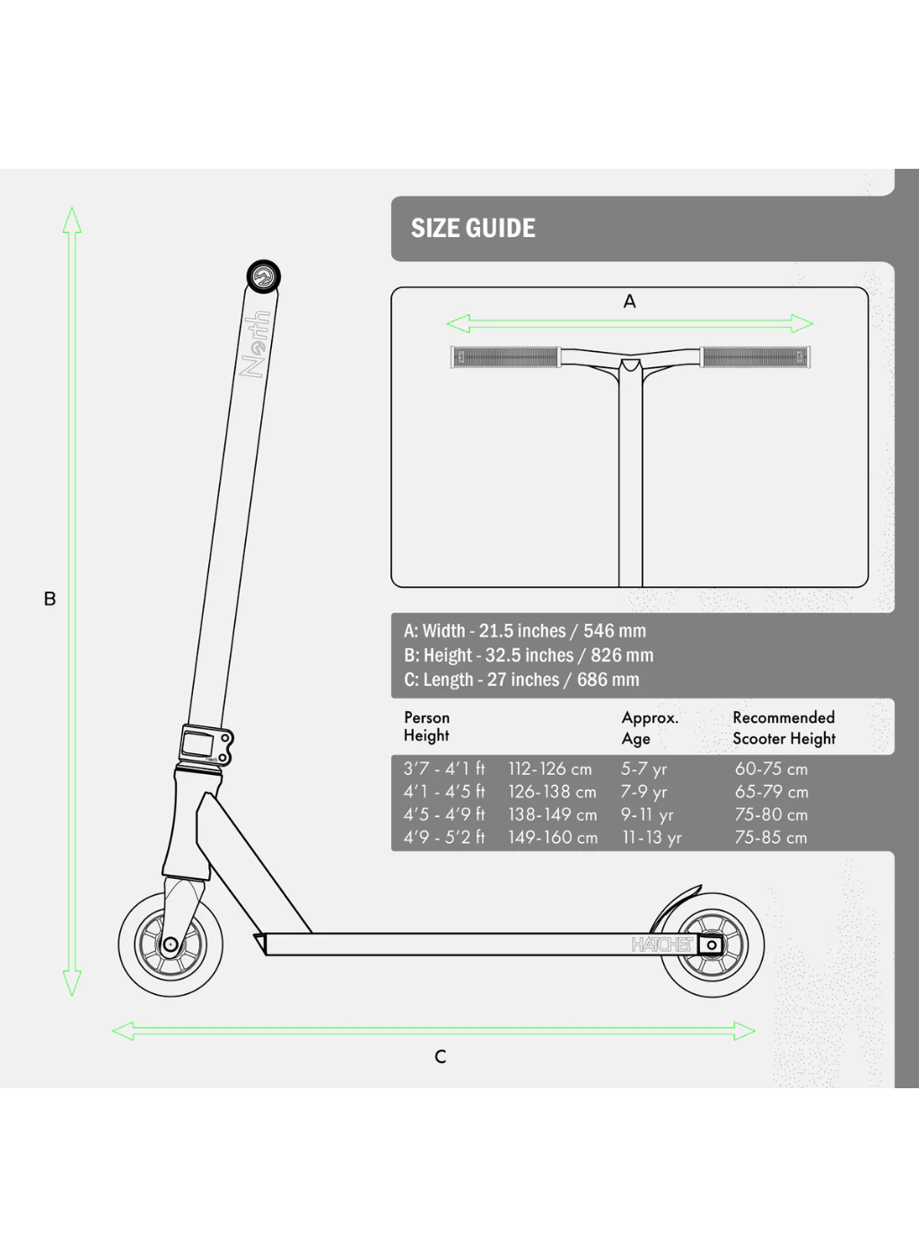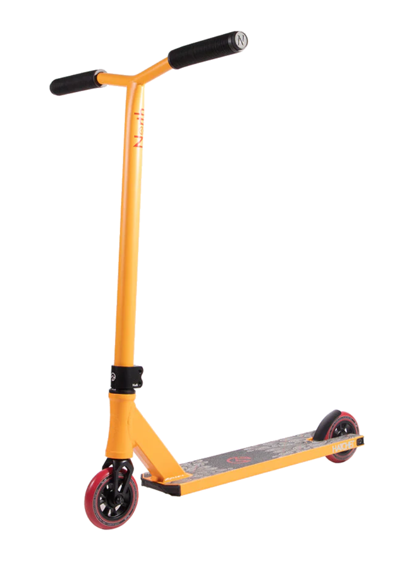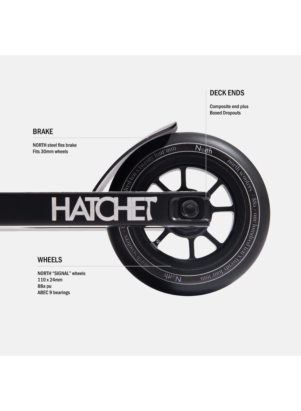 Create an accountTOP QUALITY COMPONENTS: The star of the Hatchet is a 4.7“ x 19.5” boxed deck, completed with both North branded deck end plugs and blunt plate. Along with the new deck, this complete also feature an all-new aluminum fork, Our classic y bar for some added strength and style, 110mm signal wheels and our essential grips. All these features make for a scooter that is versatile, durable, and lightweight. Overall, a great starter scooter that you can grow with.