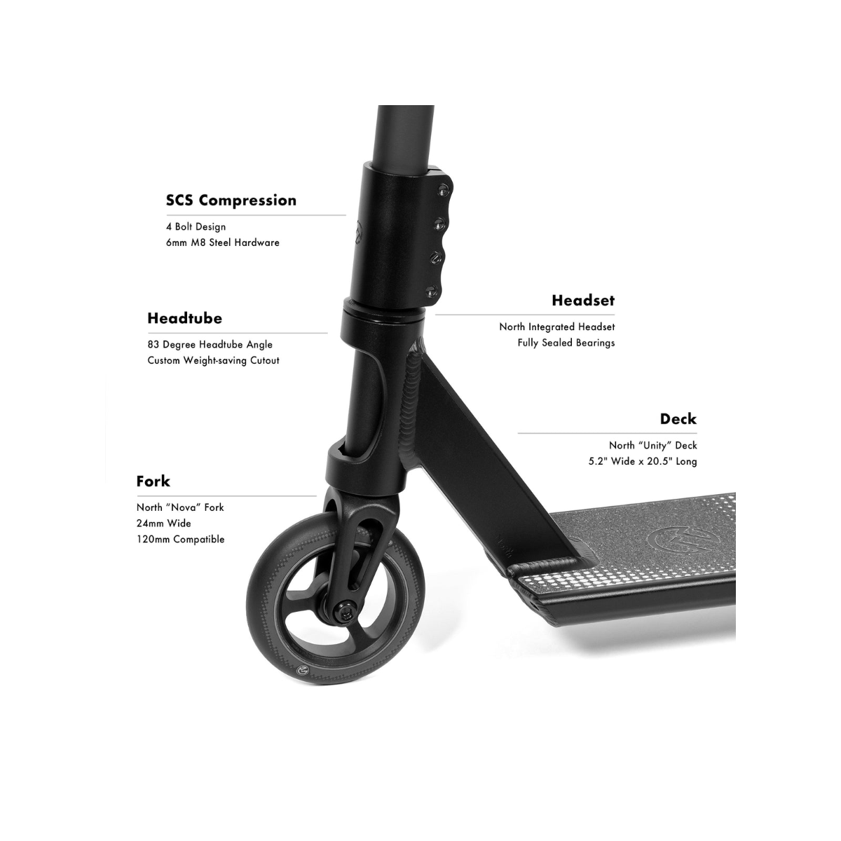 - Deck: North Unity boxed end deck 5.2" wide x 20.5” long (6061-T6 alu)
