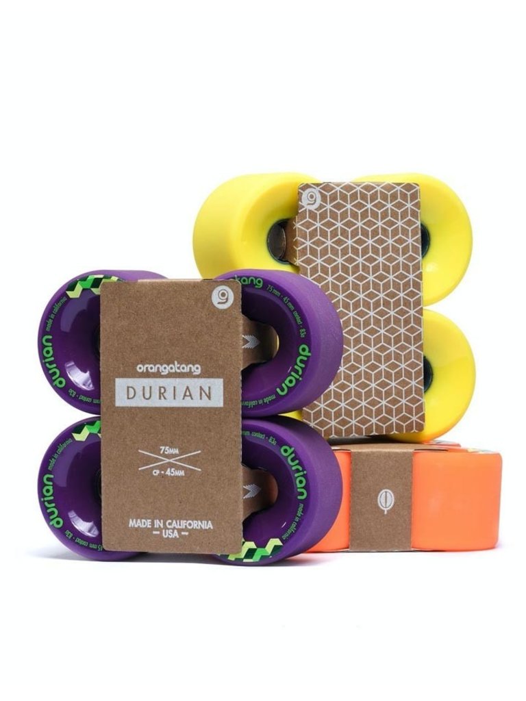 Much like its botanical namesake, the Durian is a big, meaty, and succulent gob of urethane designed to carry you across town to the not-so-local fruit stand or to be smeared liberally over your favorite downhill freeride run. The Durian is poured in our proprietary Happy Thane formula for high roll speed, plush feel, and smooth, predictable drifts. Purchase price includes set of 4 wheels.