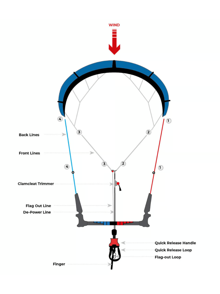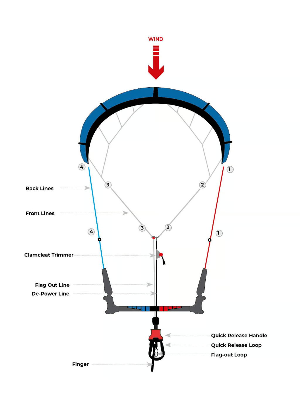 Fool proof line connectors prevent incorrect rigging of the flying lines to the kite.