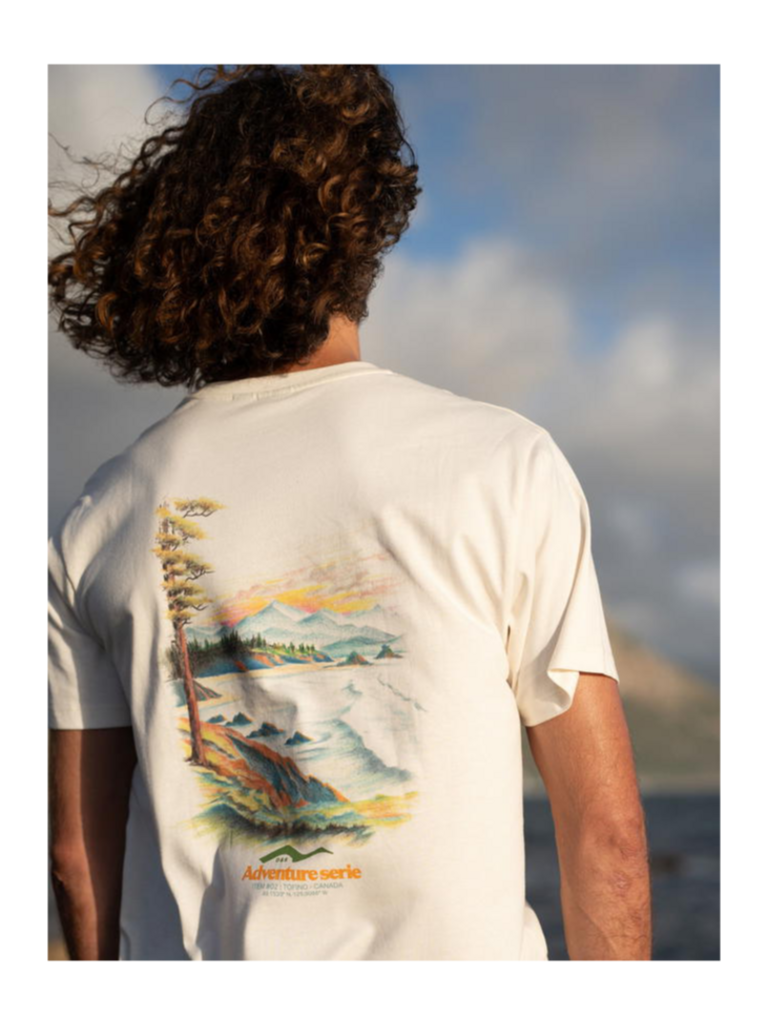 The TOFINO TEE is part of the "Dad & Son" Adventure Series, featuring artwork inspired by places close to our hearts created by our co-founder Jérémy and his father. Both are architects by training, and share a passion for drawing and artwork. It showcases one of three mythic outdoor destinations: Tofino, a surf and nature paradise on Vancouver Island. Where waves crash and peaks rise, this wild landscape is home to otters, giant octopuses, and a deep-rooted sense of freedom. The design captures that spirit, with a nod to the raw, untamed edges of the Pacific Northwest. Printed on 180g organic cotton jersey with a timeless fit, it’s built for those who dream of the Pacific and live for salt air and forested trails.