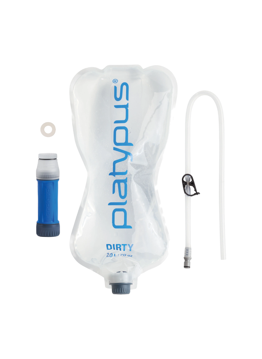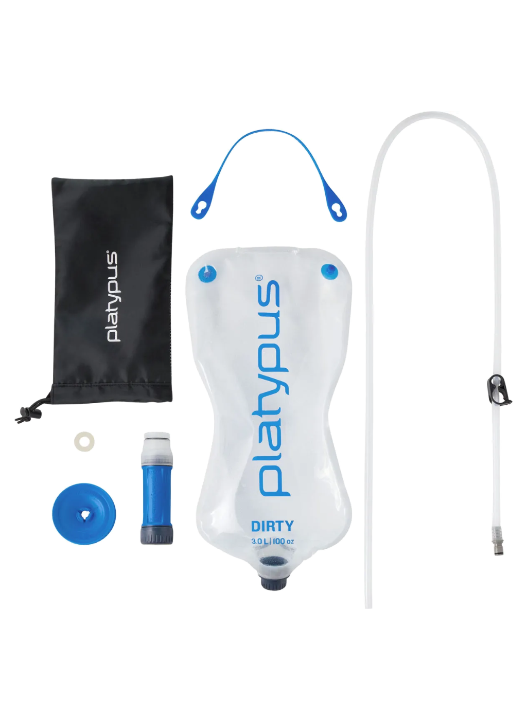 Comes with QuickDraw Filter, 3L QuickDraw dirty reservoir with cap, dirty-side cap, ConnectCap™ with cover, Bottle Adapter, backflush washer, hose with quick connector, shutoff clamp and storage bag.