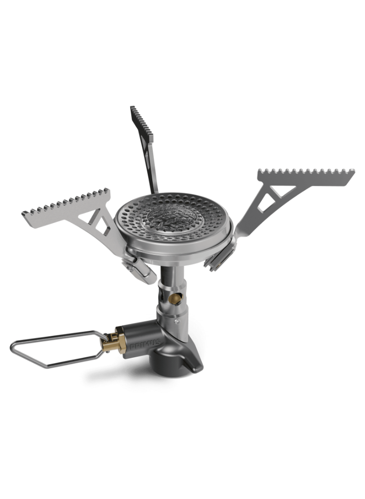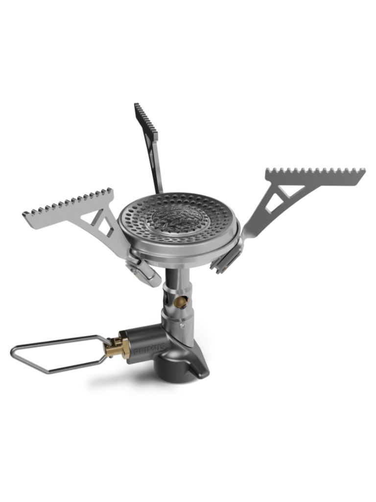 Micron III Piezo is a sit-on-top gas stove with a matchstick-style Piezo igniter and foldable pot supports. It comes with a durable nylon storage bag. Pair with a smaller pot set (sold separately). Micron III Piezo has no regulator and gas is not included – use with Primus Power Gas, Summer Gas or Winter Gas.