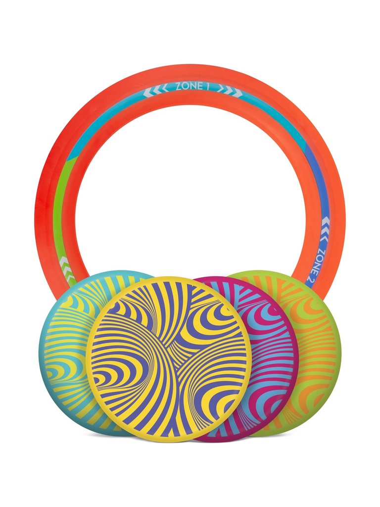 Bocce meets disc golf. Throw the Flying Target Ring to set the course challenge. Keep track of throws for each player. Use disc zones to create optional rules.